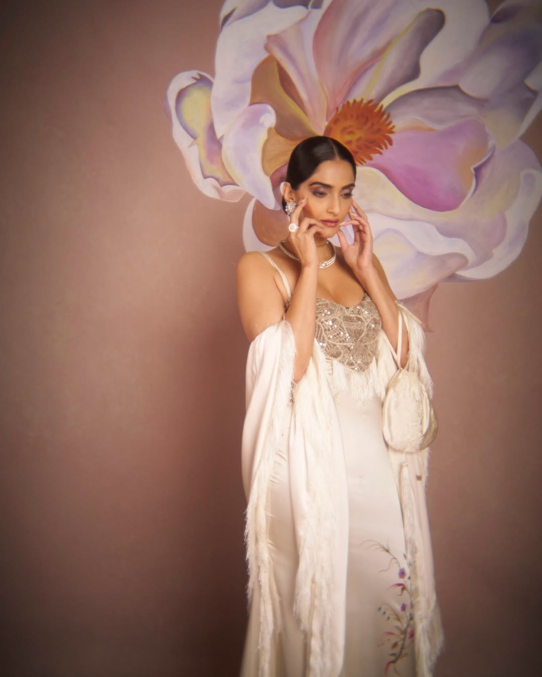 Her accessories—statement earrings, a delicate necklace, and a vintage-style pearl clutch—enhance the regal charm of her look. The fringed detailing on her outfit adds a touch of old-world glamour, reminiscent of the golden era of fashion. Her sleek, pulled-back hairstyle allows her sharp features to take center stage, with her luminous skin and perfectly sculpted brows adding to her poised appearance.