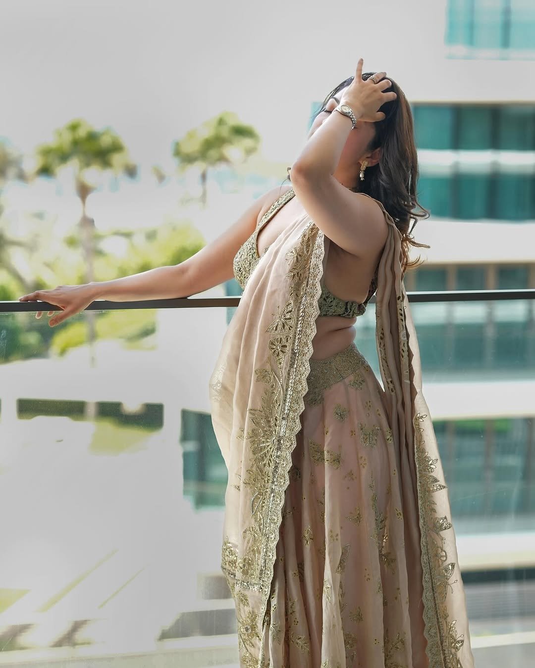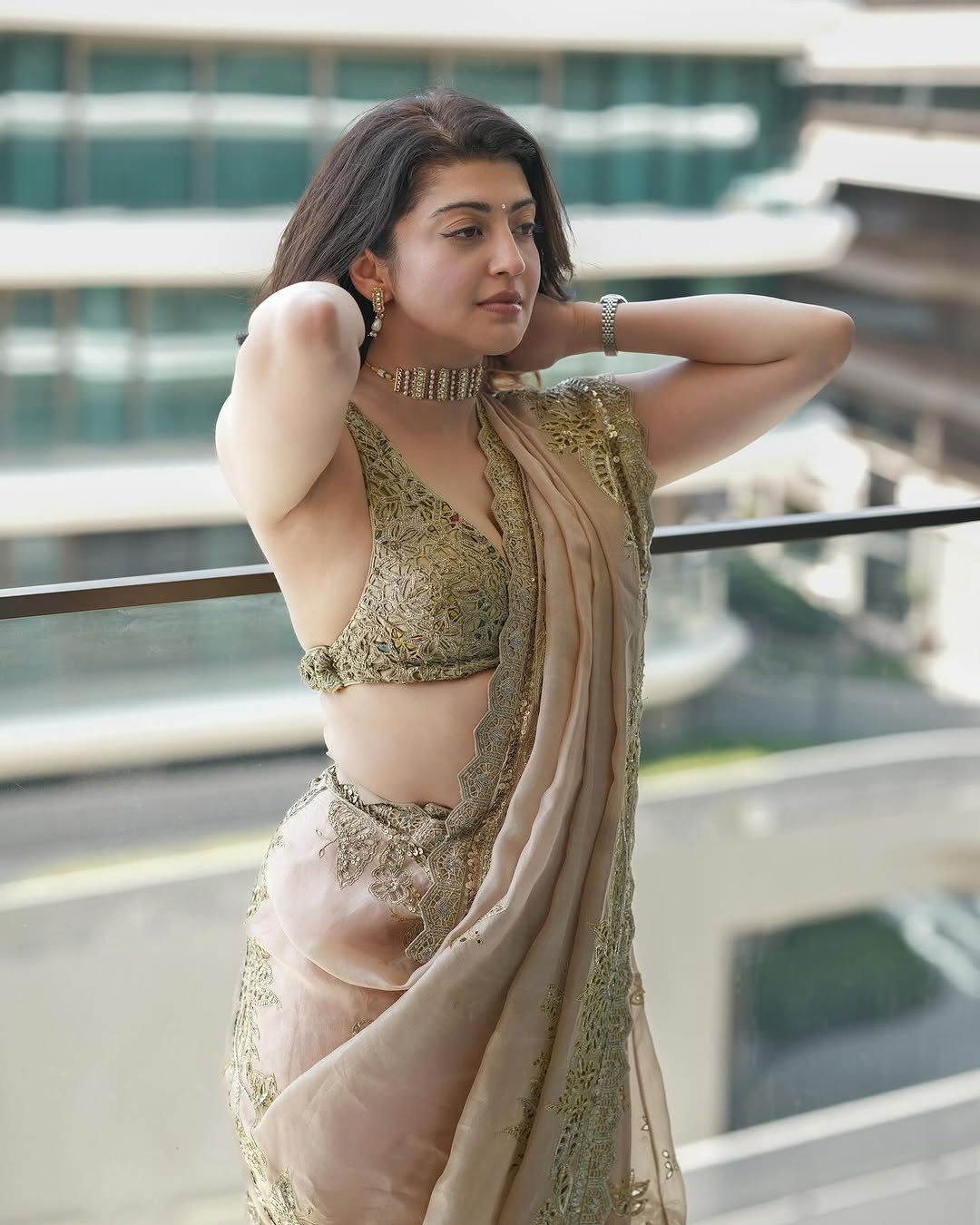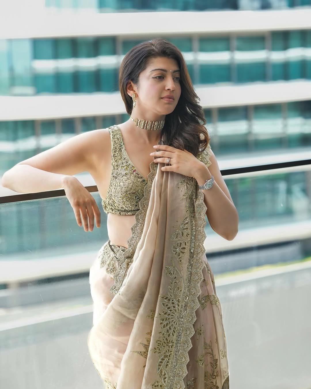 In this captivating look, Pranitha dons a pastel beige saree richly adorned with intricate golden embroidery. The delicate shimmer of the fabric catches the light beautifully, giving her a soft, glowing aura. The saree hugs her curves gracefully, highlighting her feminine figure with an effortless sophistication. The pleats and pallu are styled with a subtle flair, allowing the focus to rest on the lavish craftsmanship and her natural poise.
