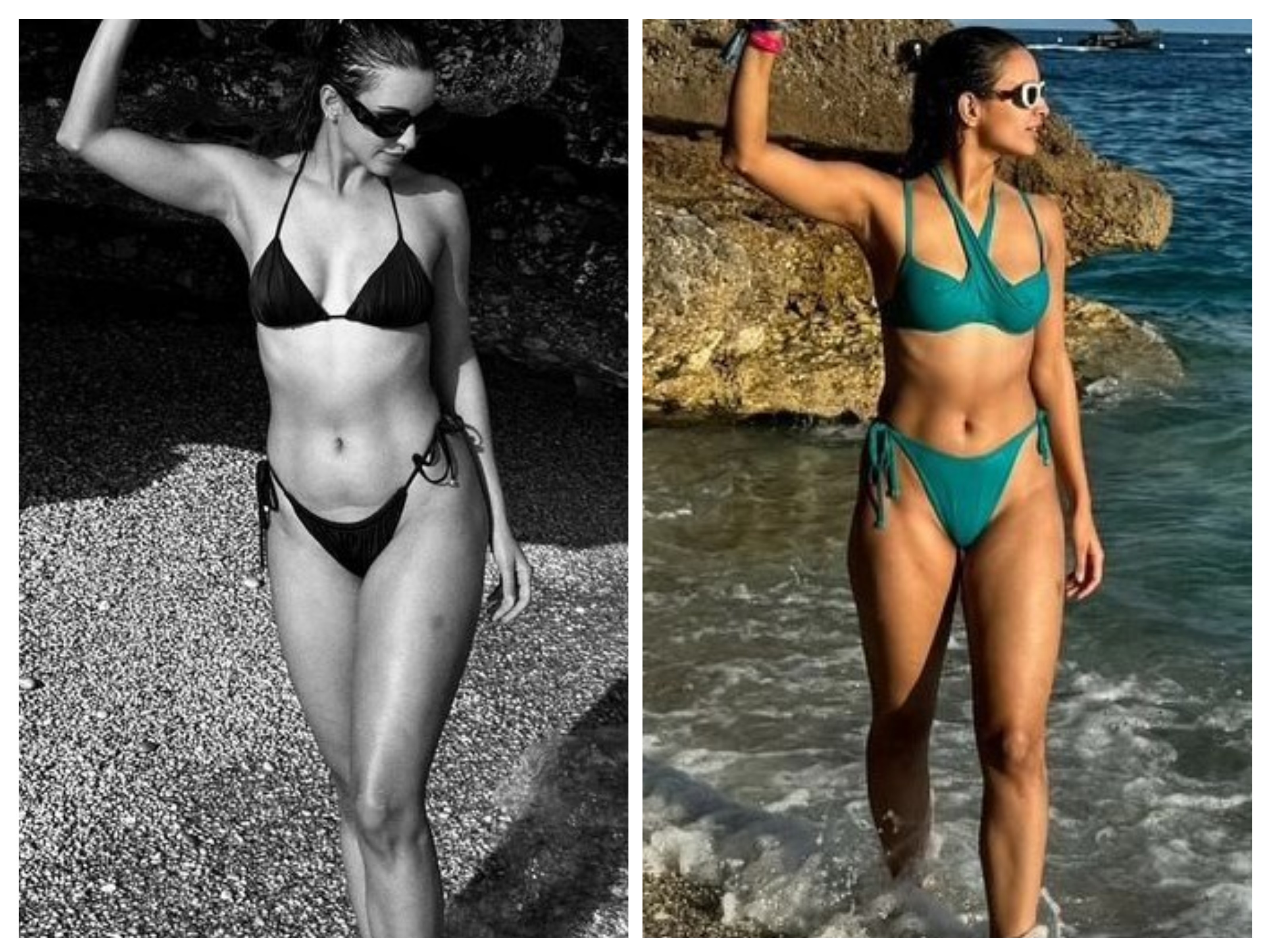 In another look, she switches to a turquoise bikini that brings out her sunlit glow and the crystal blue of the sea behind her. The halter-style top and side-tie bottoms highlight her well-sculpted curves, while the sea breeze plays with her hair, making the whole frame feel like a still from a tropical photoshoot.