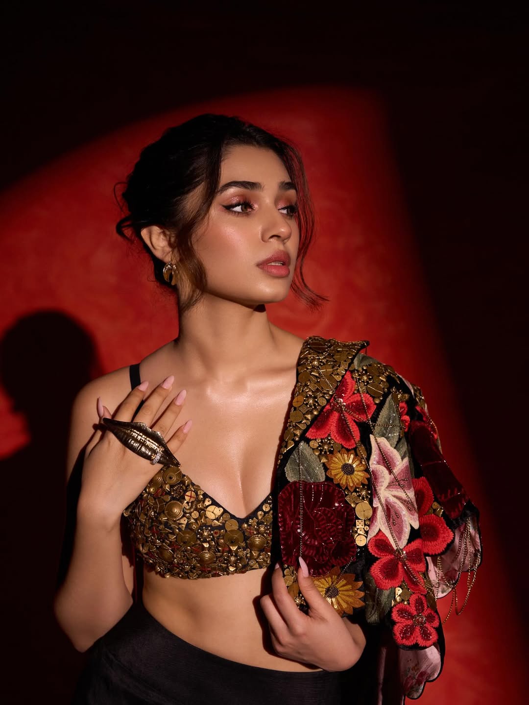 Krithi’s smoky eyes and nude lips play the perfect contrast to her vivid ensemble, while her metallic heels add just the right dose of shimmer to her stride. The look captures her at her most magnetic — soft yet powerful, sensual yet sophisticated.