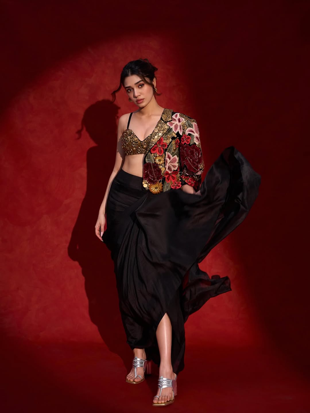 Her flowing black slit skirt flutters dramatically, revealing toned legs that command the spotlight with every stride. It’s daring yet deliciously elegant — a perfect tease between mystery and magnetism. Paired with a deep-cut bralette and a velvet floral-embroidered cropped jacket glimmering with gold accents, the outfit fuses vintage glamour with high-end seduction.