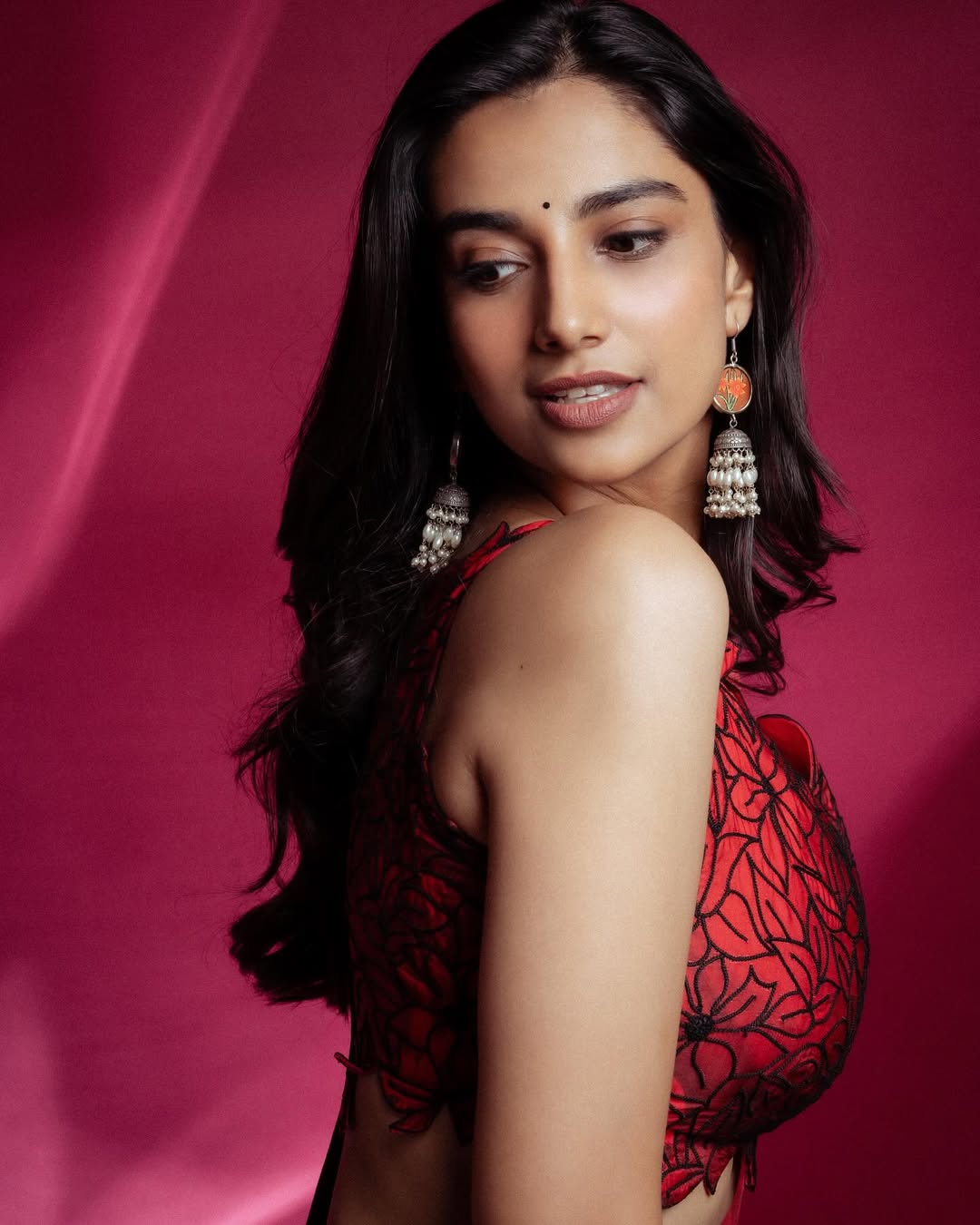 The saree hugs her graceful silhouette, flowing effortlessly around her slender frame, while the handcrafted floral blouse with intricate embroidery adds a bold twist. The sleeveless crop-style blouse flaunts her toned midriff, lending a hint of allure without overshadowing the saree’s classic charm. The deep red palette enhances her natural glow, making her look like a vision straight out of a romantic Tamil-Telugu blockbuster.