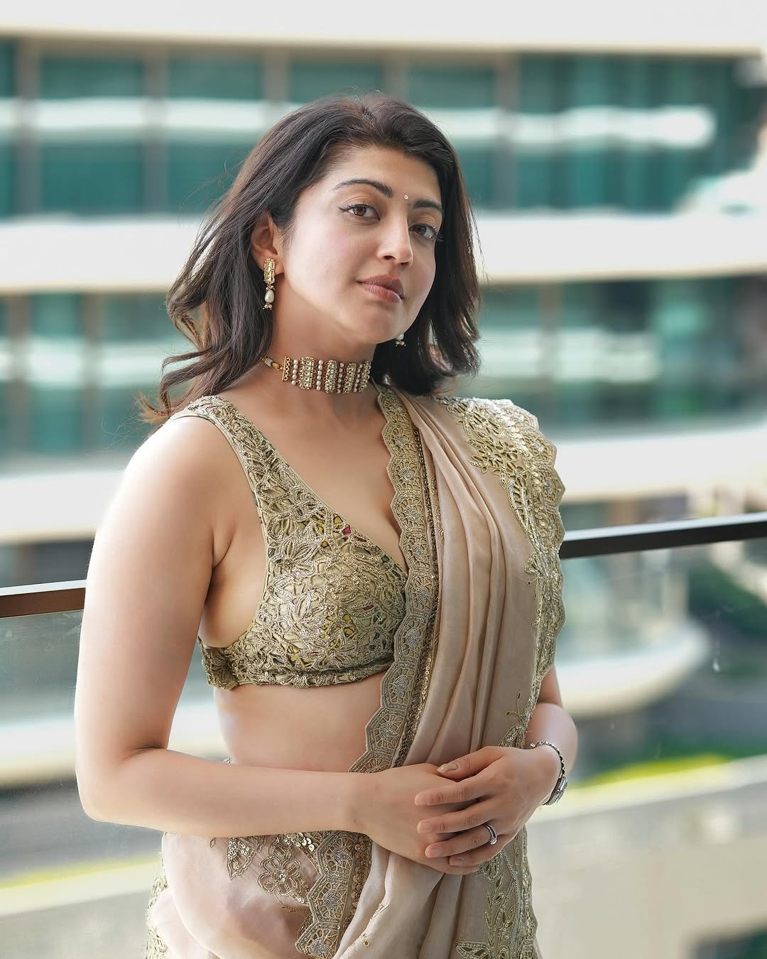 In this captivating look, Pranitha dons a pastel beige saree richly adorned with intricate golden embroidery. The delicate shimmer of the fabric catches the light beautifully, giving her a soft, glowing aura. The saree hugs her curves gracefully, highlighting her feminine figure with an effortless sophistication. The pleats and pallu are styled with a subtle flair, allowing the focus to rest on the lavish craftsmanship and her natural poise.