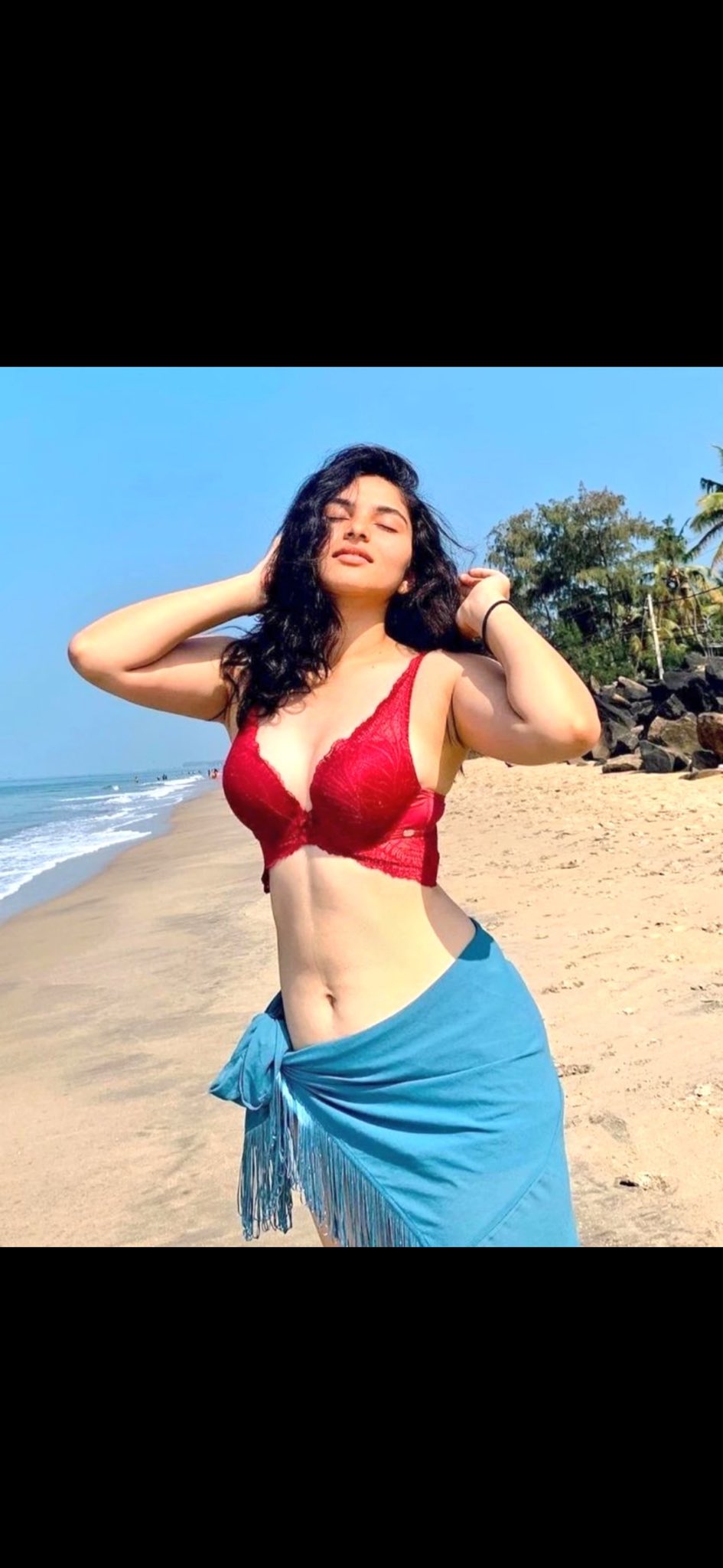 In this irresistible photo, Kayadu flaunts a crimson red bralette that cups her full bust with bold confidence. Her bare midriff flows into a tightly knotted teal sarong, slung low on her hips, barely hiding her shapely thighs. The slit reveals just enough to tease—a glimpse of skin, a hint of wildness, a promise of more.