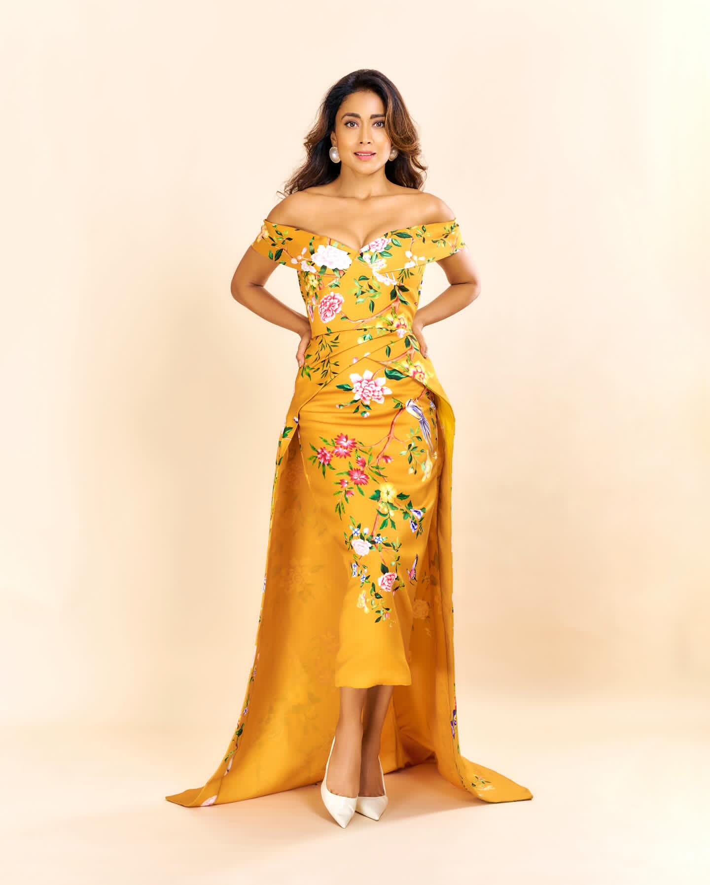 The off-shoulder neckline slips down seductively, drawing attention to her sultry figure, while the body-hugging fit accentuates her slim waist and alluring shape. The floral patterns add a dash of feminine sweetness, but make no mistake — this look screams bold, sexy, and powerful. With her luscious waves tumbling around her face, those oversized pearl earrings, and a playful pose, Shriya looks nothing short of a goddess of allure.