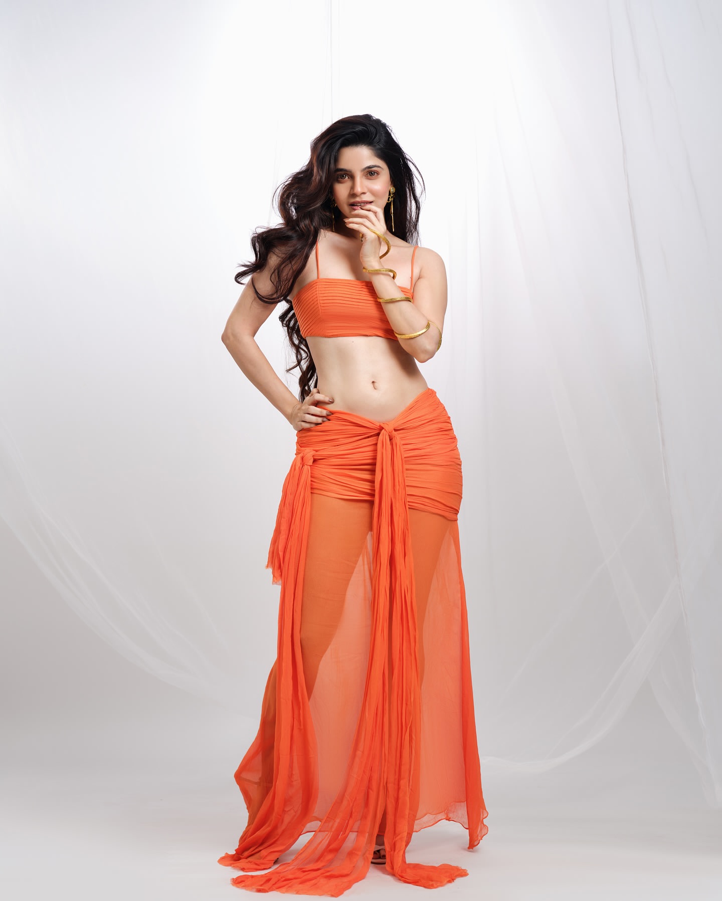 She dazzles in a tiny strappy orange crop top paired with a sheer wraparound skirt tied teasingly at the waist. The outfit boldly puts her slender waist, toned abs, and captivating navel on full display. The flowing drape and high slit add a ravishing touch, teasing her long legs and making her look every bit the alluring bombshell.