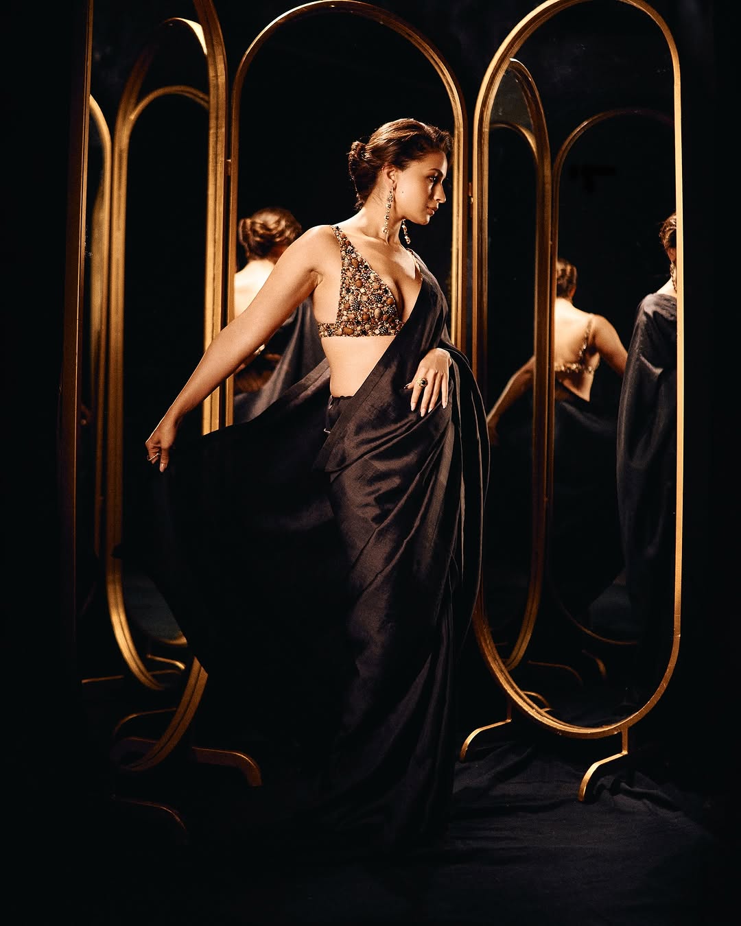 Alia Bhatt has always been the poster girl for contemporary elegance — and once again, she set the fashion world ablaze in this striking black Sabyasachi saree. The look, unveiled at a high-profile event, was the perfect fusion of old-world charm and modern sensuality, proving why Alia remains a style chameleon of her generation.
