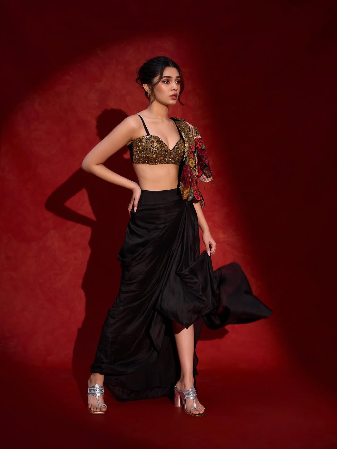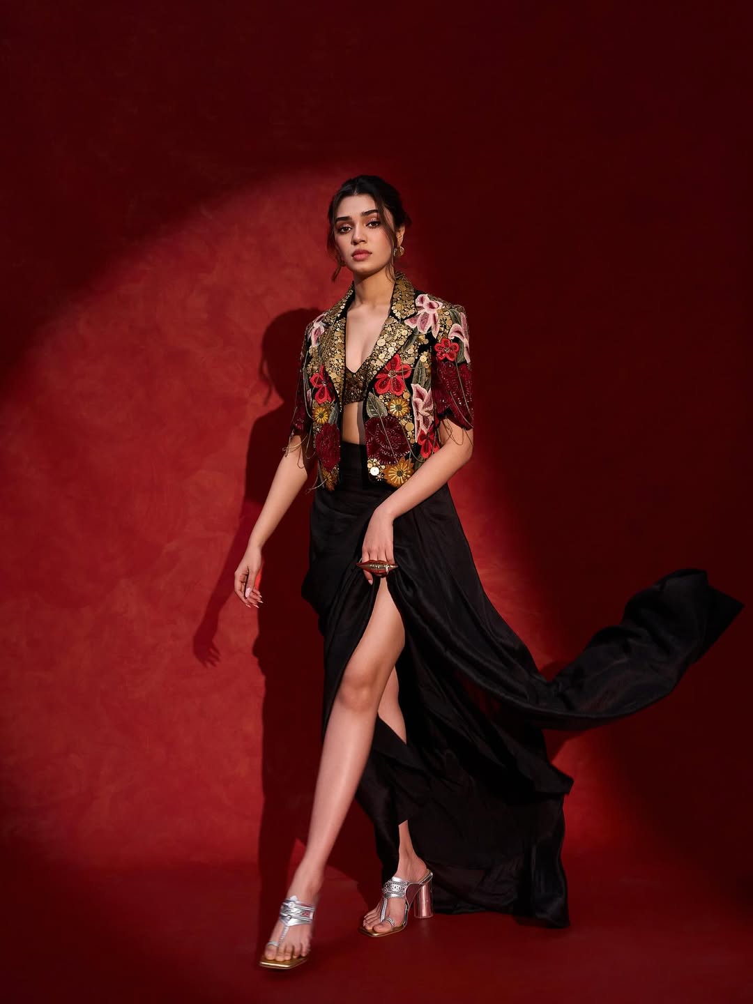 Her flowing black slit skirt flutters dramatically, revealing toned legs that command the spotlight with every stride. It’s daring yet deliciously elegant — a perfect tease between mystery and magnetism. Paired with a deep-cut bralette and a velvet floral-embroidered cropped jacket glimmering with gold accents, the outfit fuses vintage glamour with high-end seduction.