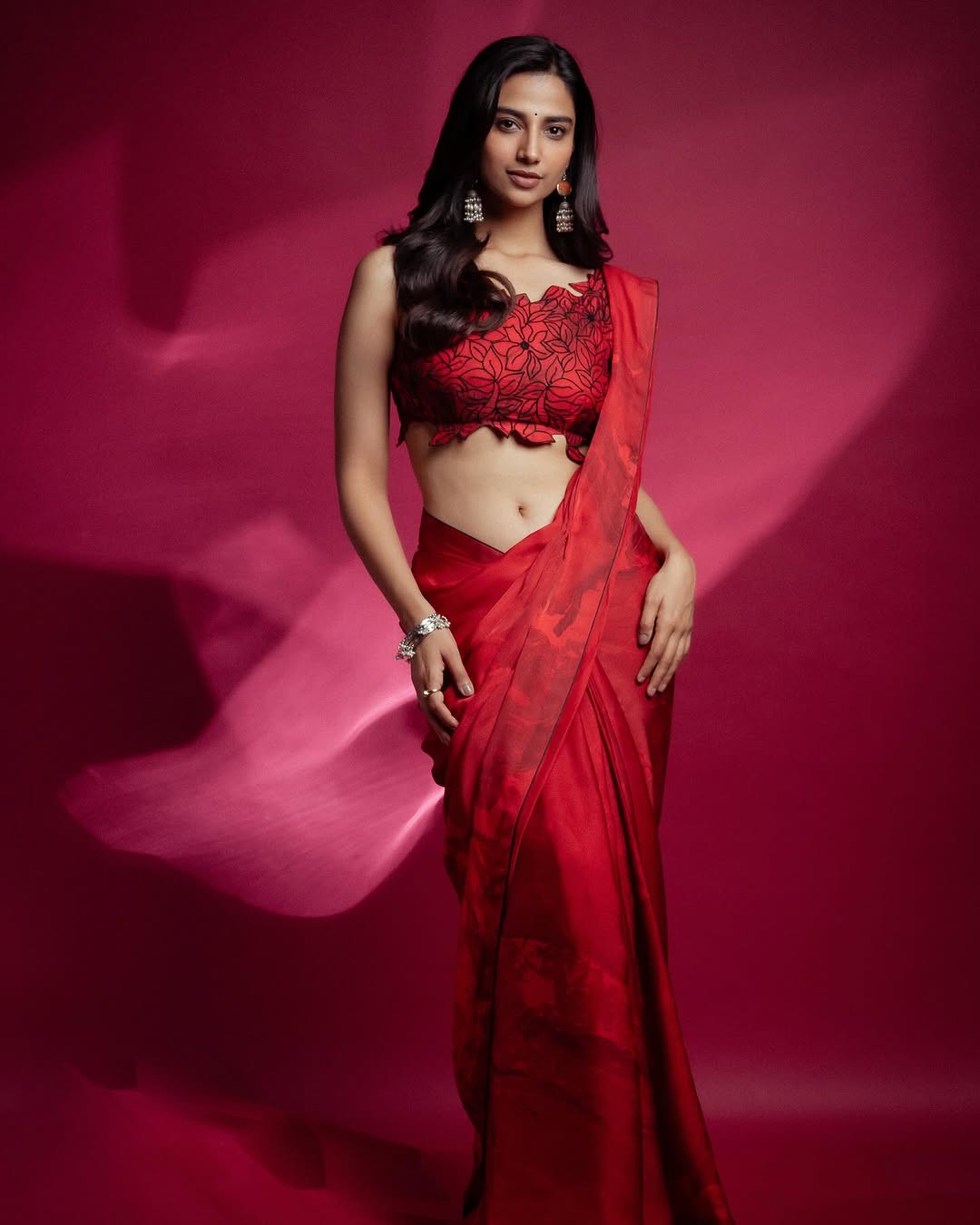 The saree hugs her graceful silhouette, flowing effortlessly around her slender frame, while the handcrafted floral blouse with intricate embroidery adds a bold twist. The sleeveless crop-style blouse flaunts her toned midriff, lending a hint of allure without overshadowing the saree’s classic charm. The deep red palette enhances her natural glow, making her look like a vision straight out of a romantic Tamil-Telugu blockbuster.